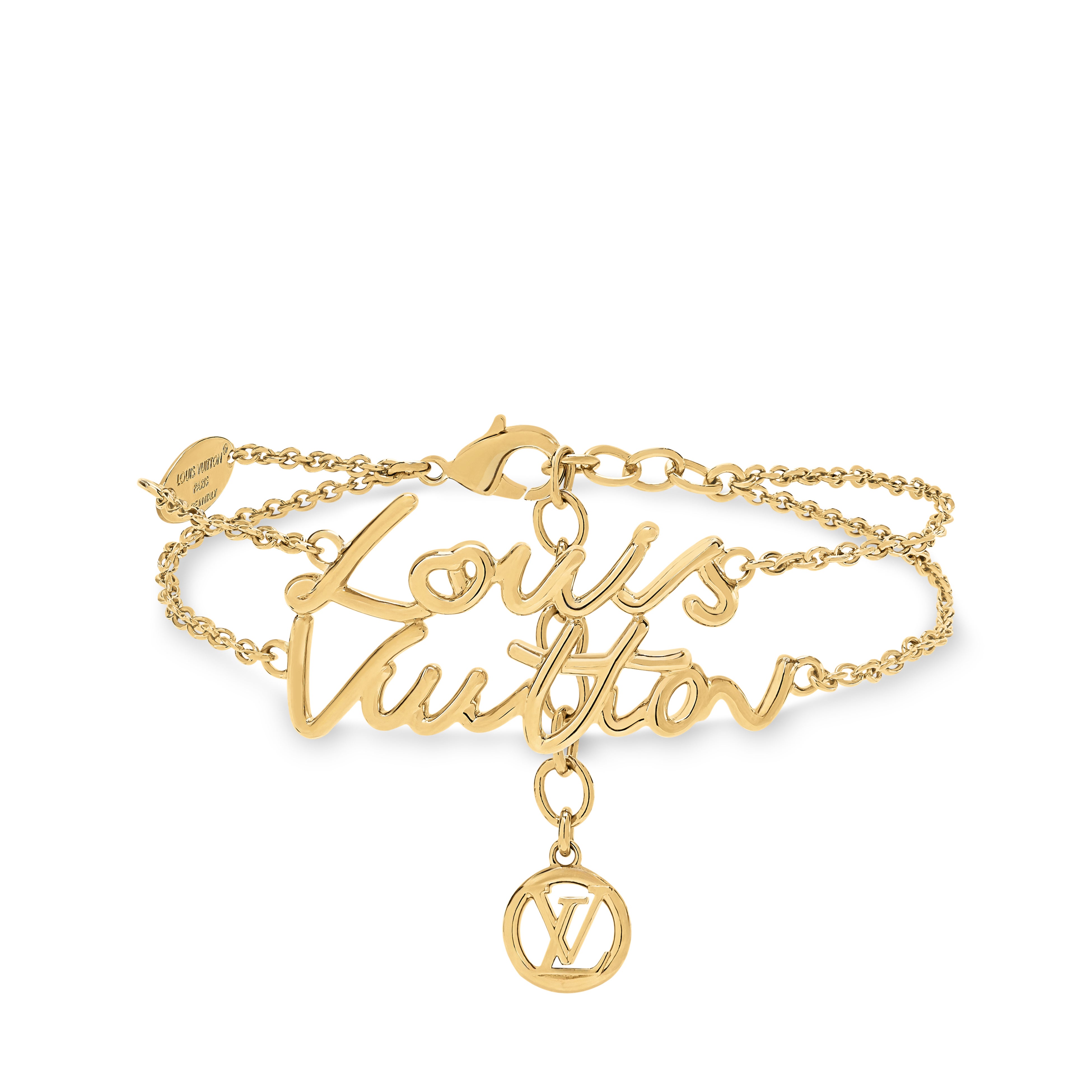 ルイ・ヴィトンの新しいシグネチャーをあしらった、「ブレスレット・LV スクリプト」。光沢感のあるゴールドカラーのメタルで仕上げたアイテムです。2本のチェーンを繋げて仕上げられ、それぞれにはメゾンの名が滑らかで流れるような手書き風で施され、独特のデザインが光ります。単体でも重ね着けでも、あらゆる装いにチャーミングな華やかさを添えます。