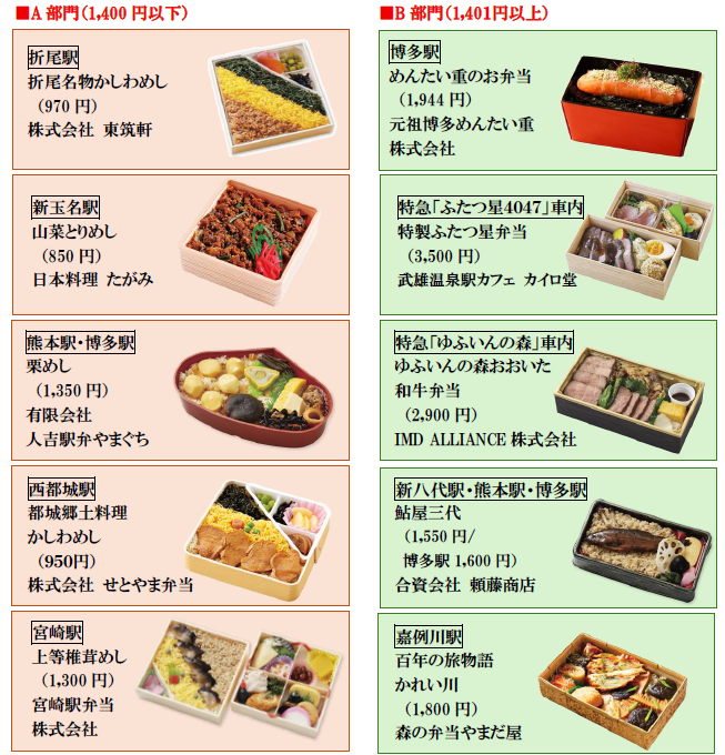 ・九州各県から厳選された駅弁の中から、お客さまの投票によって賞を決定するイベントです。・今年度は初めて「駅社員おすすめの駅弁」として全52 品をご紹介。駅弁グランプリ初登場の