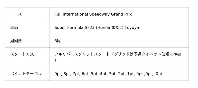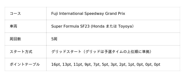 今回は下記のタイムスケジュール・レースフォーマットにてレースを実施し、勝者を決定します。13:28~13:38 スプリントレース1.