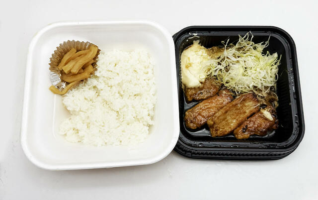 生姜焼きの豚肉は厚切りで、副菜のキャベツやマヨネーズとも実によく合います。見た目よりもさっぱりした味わいなので、朝にもバッチリ。この味から始まる朝は、なんだか力がみなぎりそうな予感さえします。