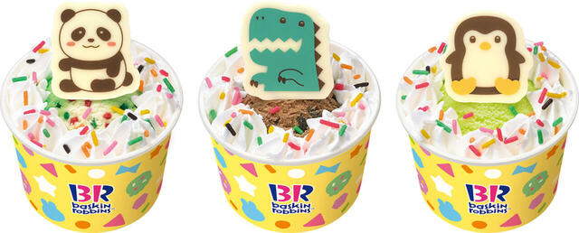好きなスモールサイズのアイスクリームにホイップクリーム、カラースプレー、チョコなどをトッピングし、かわいいキャラクターに変身させたもので、「うさぎ」「ぱんだ」「きょうりゅう」「ぺんぎん」の4種が通年販売中。