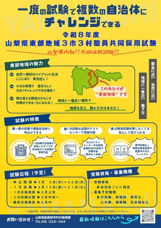 山梨県(知事 長崎 幸太郎)は、県東部地域の3市3村と連携し、県内で初となる「共同採用方式」による市町村職員採用試験を実施します。本試験は従来の公務員試験と比べて受験しやすい内容となっており、より多くの方に挑戦していただける試験となっています。
