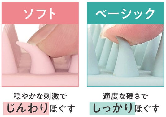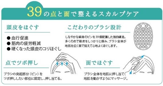 手になじんで持ちやすいオーバル型で、39のピンがしっかりと地肌をとらえて、面で動かし頭皮をやわらげます。しっかり刺激するベーシックタイプとやさしくケアできるソフトタイプ。