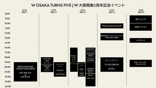 ラグジュアリー・ライフスタイルホテルW大阪(所在地:大阪市中央区南船場4丁目1番3号、総支配人:ピーター・ル ーカス)は、開業5周年を祝し、2026年3月12日(木)から16日(月)までの5日間、アニバーサリーイベントを開催いたします。その中日となる3日目、3月14日(土)には、W大阪のエッセンスを凝縮した1日限定のフェスティバルイベント 「W FES(Wフェス)」 を実施します。本イベントでは、ブランドの核である、Sound(サウンド)/Taste(テイスト)/Body(ボディ)/Stance(スタンス)/Scene(シーン)という5つの“パッションポイント”を軸に、音楽、アート、食体験など多彩なプログラムを展開。W大阪ならではの世界観を、1日通して体感いただけます。