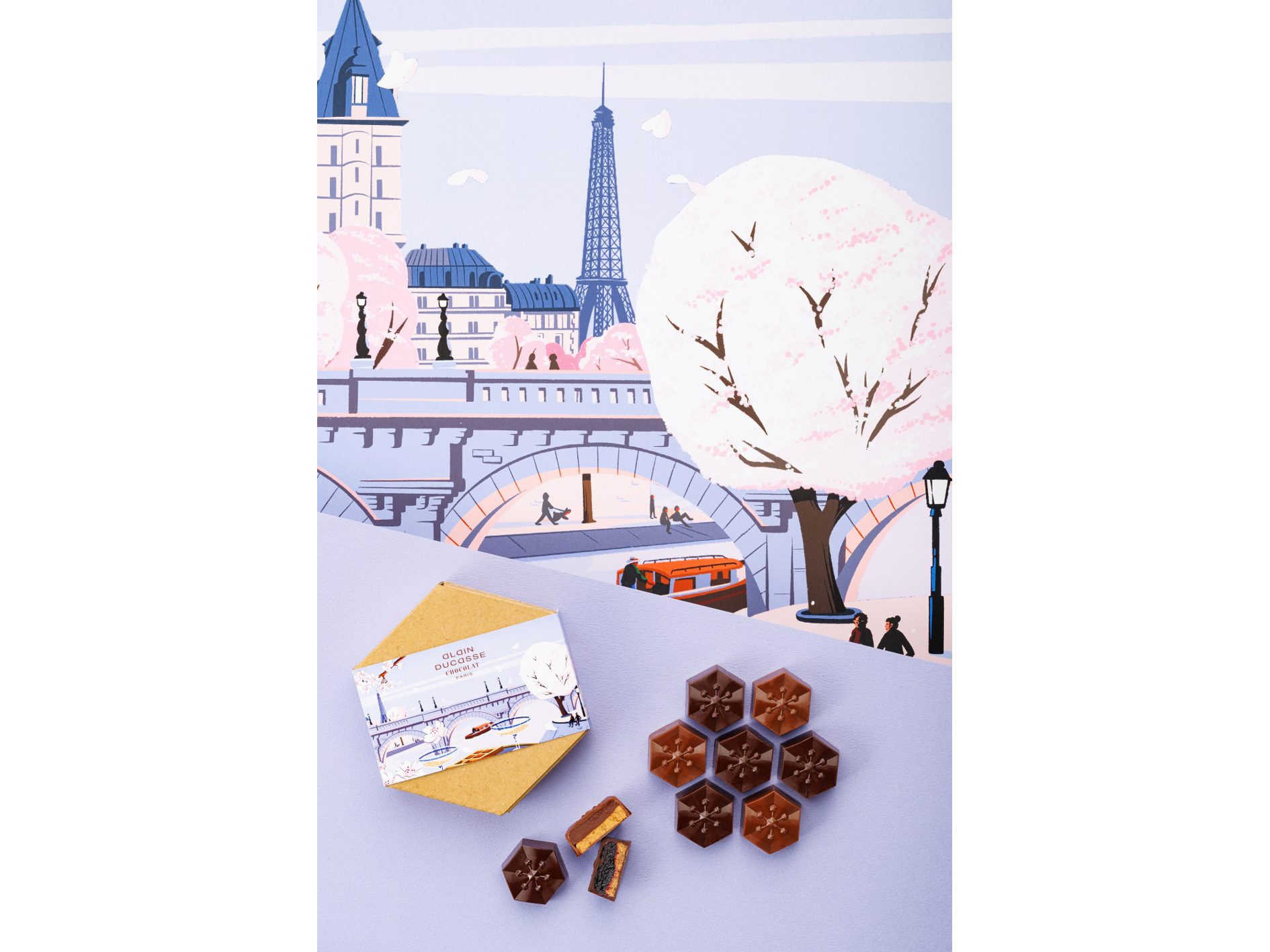 毎年人気の芸術的な幾何学デザインが印象的なサクラをモチーフにしたショコラ。今年は、ブルーベリー&カシスのジューシーなパートドフリュイとアーモンドのプラリネが2層になった「ショコラ ノワール」と、パッションフルーツ風味のキャラメルとヘーゼルナッツのプラリネが2層になった「ショコラ オ・レ」のフルーティーな2つのフレーバーを詰め合わせました。