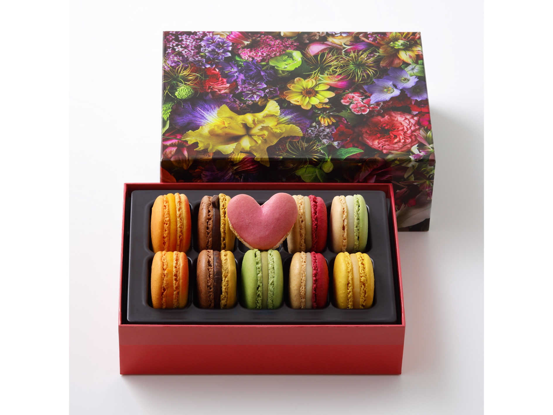 オレンジフラワーとピスタチオの「アーリア」やレモン尽くしの「アンフィニマン シトロン」、ハート形の「クール ジャルダン スクレ」など、カラフルで華やかなマカロンを詰め合わせました。フラワーアーティスト東信さんによるアレンジメントを施した限定BOXでお届けします。
