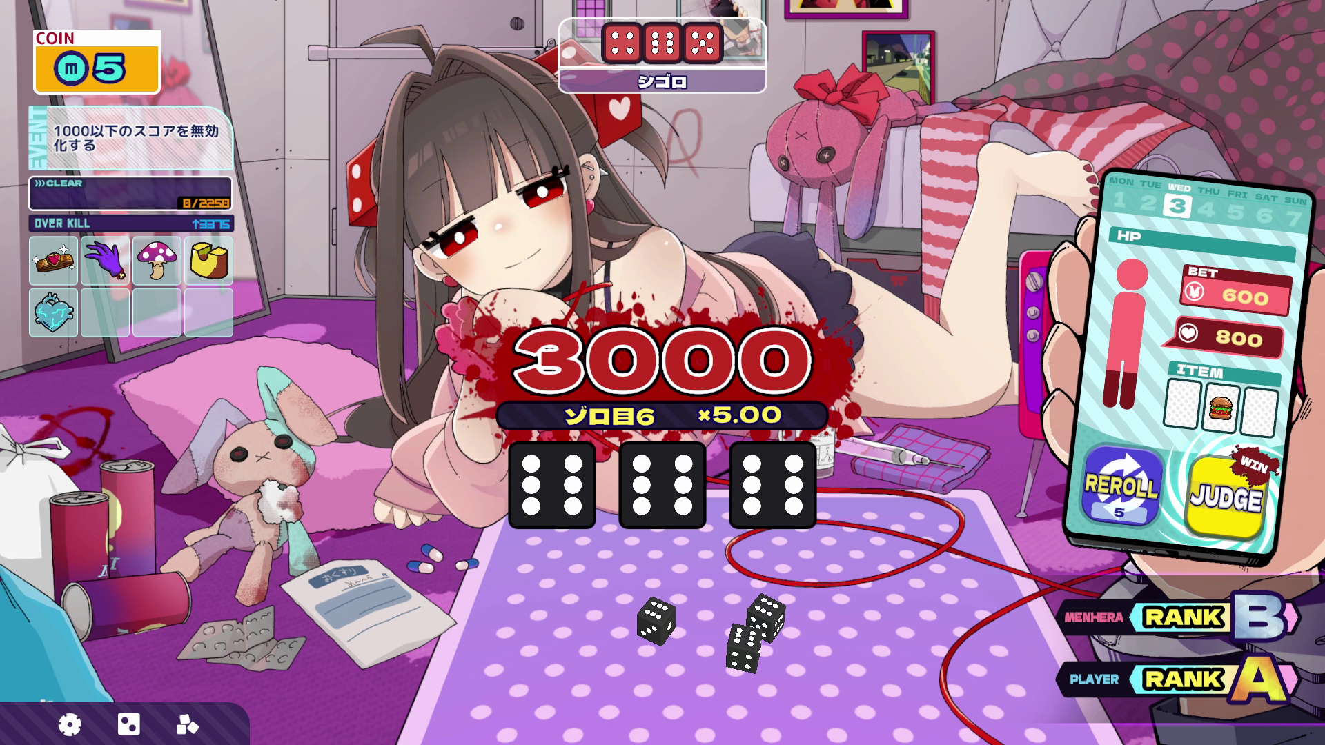 チンチロの結果からメンヘラちゃんが1日の評価を行い、その評価によってショップで使用できるコインが支給されます。