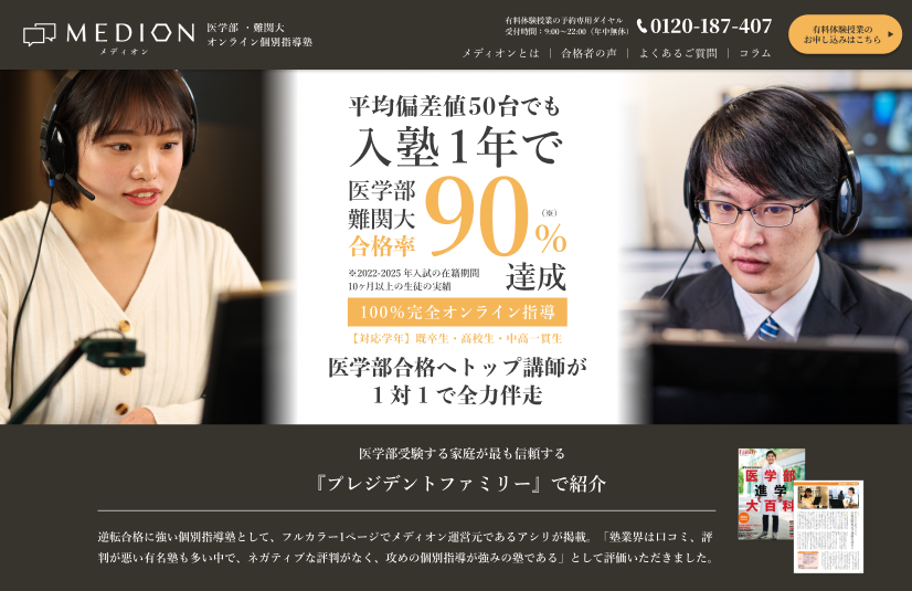 メディオンは、医学部受験・難関大受験に特化した完全1対1のオンライン個別指導塾です。全国の受験生へ場所を問わず最高品質の教育を提供しています。