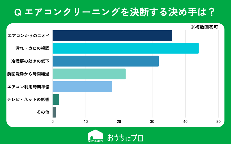- エアコンクリーニング決断の決め手になるのは「汚れ・カビの視認」「エアコンからのニオイ」「冷暖房の効きが悪くなった」。