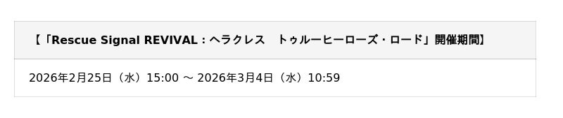 ※本イベントは2025年に開催された「Rescue Signal :ヘラクレス トゥルーヒーローズ・ロード」の復刻開催となり、復刻にあたり一部調整が行われております。