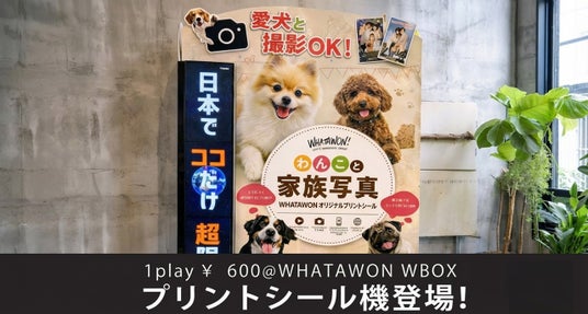 WHATAWON WBOXに、愛犬・ペットと一緒に撮影できるオリジナルプリントシール機が新登場。その場で思い出が“かわいいシール”に。