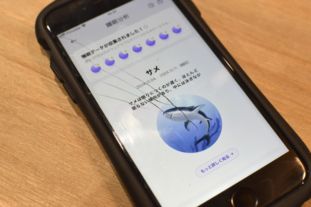 これが意外と面白かったんです。7日間の計測データから私の睡眠を分析してくれて、動物タイプで教えてくれます。分析結果によると、私の睡眠タイプはサメなんですって。