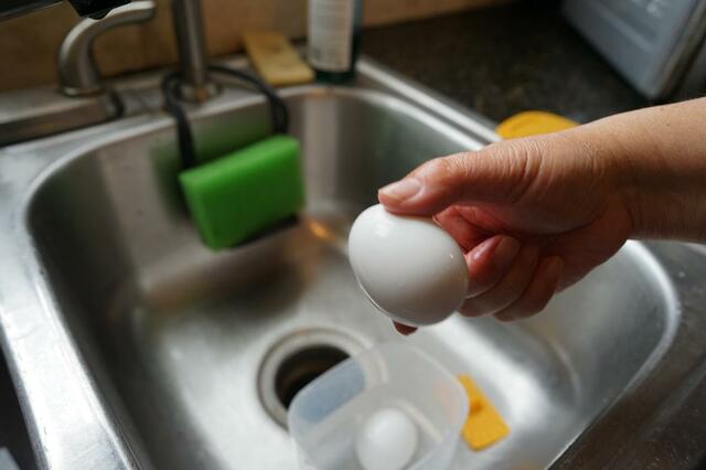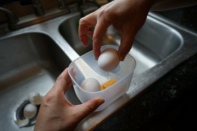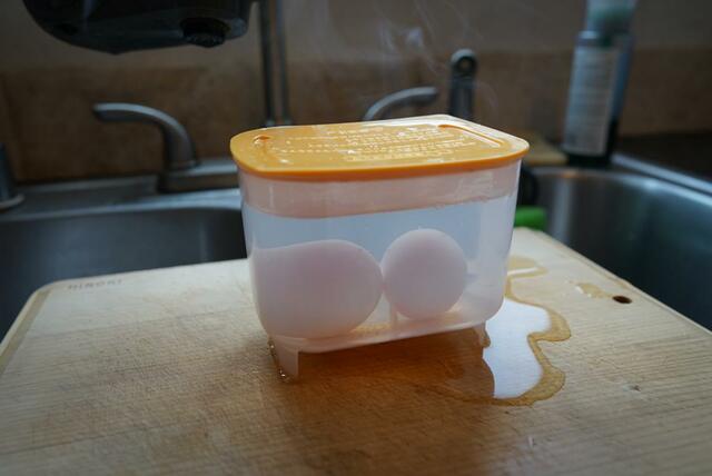 しかしこれは簡単に作れちゃいます。まず、卵を2個「本格温泉たまご器」にセットし、シンクに置いてお湯を注ぐだけ。