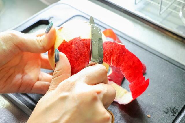 包丁やナイフで皮をむく要領でI型ピーラーを使い、りんごの皮を簡単にむくことができました。