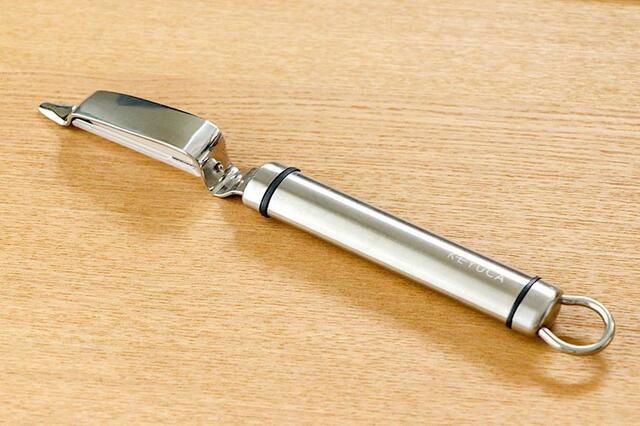 このステンレスの棒は、なんとピーラー。貝印の「I型」ピーラーです。