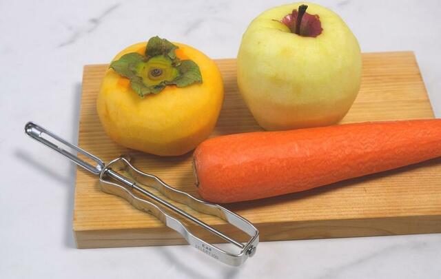 丸いものの皮がむきやすく、じゃがいもの芽などの細かい部分もきれいに取り除けるI型ピーラー。柿やりんご、にんじんの皮をむいてみたところ、この通り、皮は薄くきれいにむくことができました。