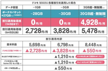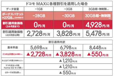 *4 ボーナスパケット27GBは「ドコモ MAX」のステップ1、ステップ2の前に適用し、ステップ1の料金で28GB/月までご利用可能になります。ステップ2の料金で30GB/月までご利用可能です。使用されなかったボーナスパケットのデータ量は、翌月へのくりこしはされません。