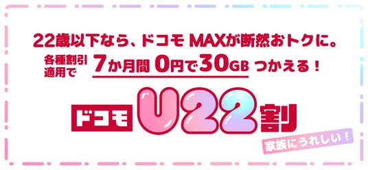 ※「ドコモU22割」が適用終了または廃止された場合、受付期間中であっても再適用することはできません。同一の利用者で、複数回線の「ドコモU22割」は適用できません。