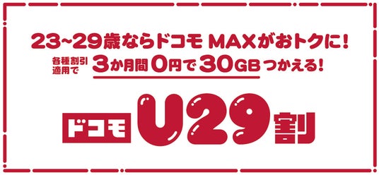 「ドコモU29割」は、新規契約(他社からの乗り換え含む)、機種変更、契約変更、プラン変更のお手続きにおいて、料金プラン「ドコモ MAX」をご利用いただく23~29歳*9のお客さまを対象に、最大3か月間*2、27GB/月のボーナスパケットの進呈*4と月々のスマートフォン利用料金がおトクになる割引サービスです。