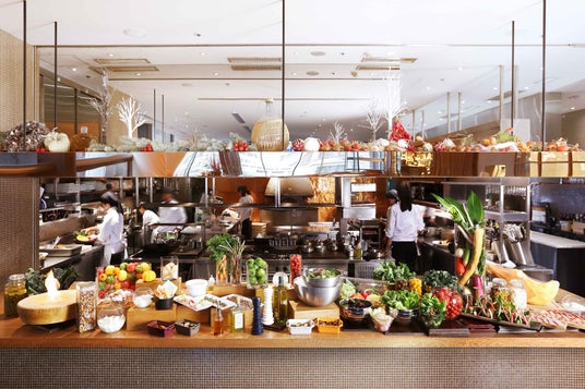 ワンフロア約890平方メートル の広い空間に、オープンキッチンを中心としたブッフェカウンターが並ぶ「XEX 日本橋」。活気ある店内で、料理を選ぶ時間そのものも楽しめます。