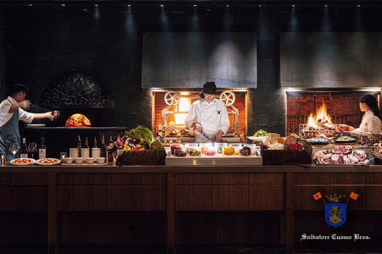 大阪・梅田駅直結の高級ブランドビル「ハービスエント」最上階に位置する「XEX WEST」。広々としたフロアに3つのレストランが共存し、ランチブッフェはオリジナリティあるイタリアン「Salvatore Cuomo Bros.」で提供します。クラシカルで落ち着いた空間でありながら、薪窯・薪焼き・炭火焼きの“炎のステージ”を望めるつくりで、調理の臨場感も魅力のひとつ。目の前で仕上がる料理を味わいながら、特別感のあるランチタイムをお過ごしいただけます。