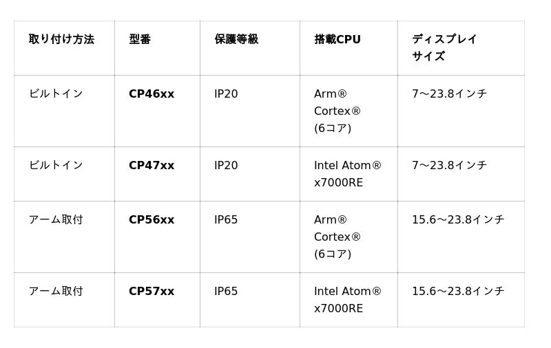 - Intel Atom(R) x7000RE搭載モデル (CP47xx / CP57xx):産業用システム(ロボット、自動化、IIoT)向けに設計された最新世代で、最大4コア、ベースクロック1~2GHzのバリエーションを提供。