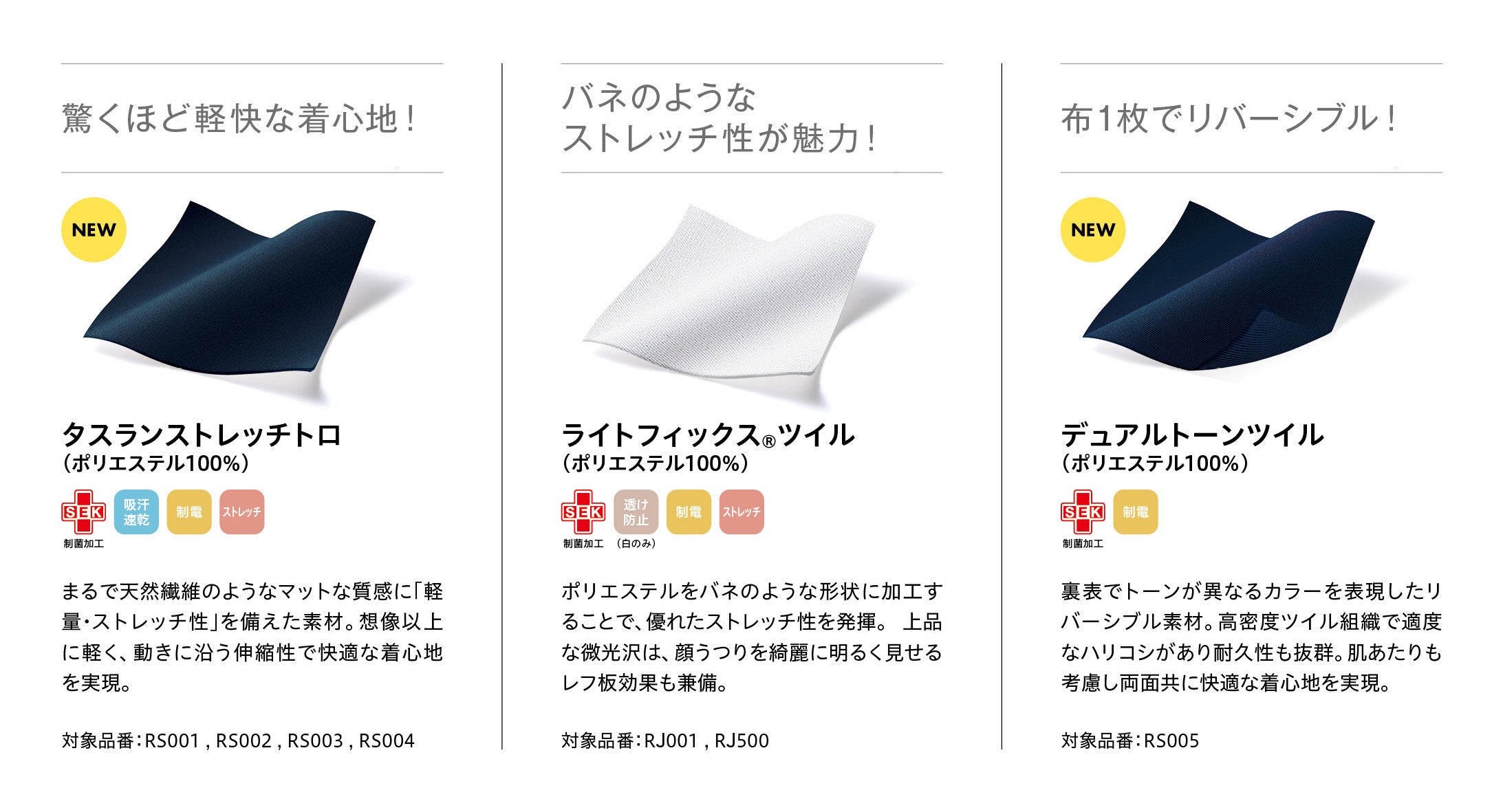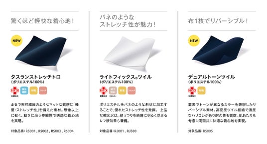 「機能性パターン」の効果で、衣服が人の動きを妨げないため、ストレッチ性に左右されることなく、素材選定が可能になりました。