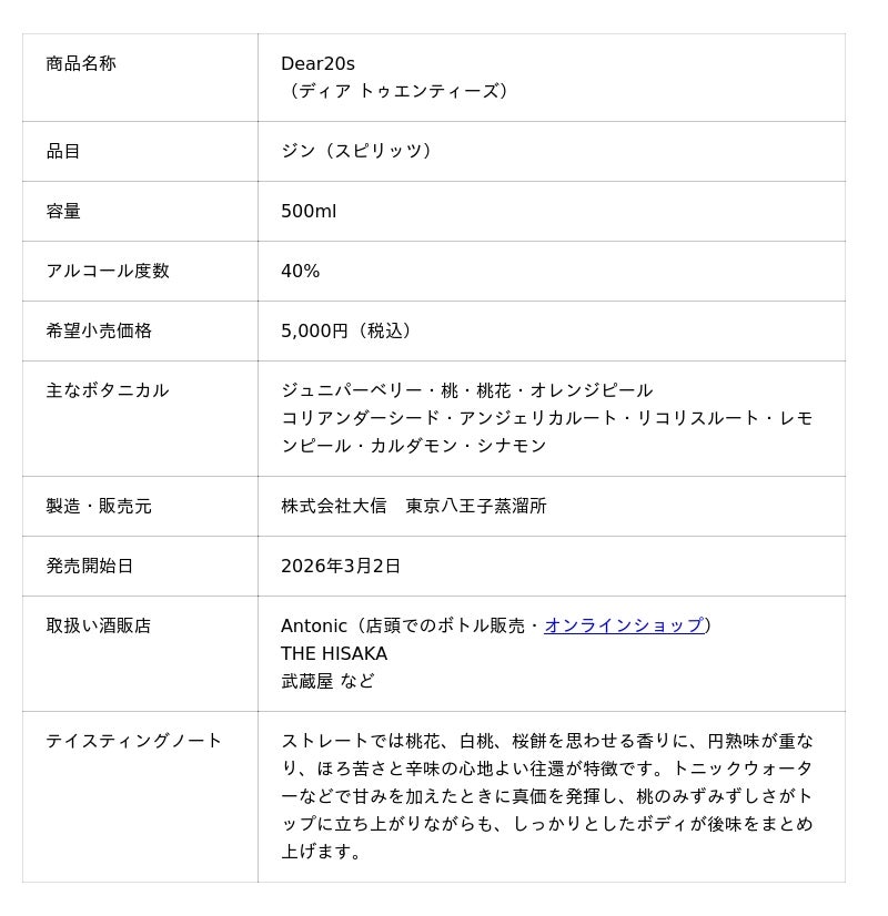 同社が発起人となり2025年7月6日、東京八王子蒸溜所での「八王子大会議」より始動した、学生20名とのジンの開発プロジェクト。半年以上に渡る開発過程で、集大成として完成したジン「Dear20s」を、2026年3月2日に発売します。