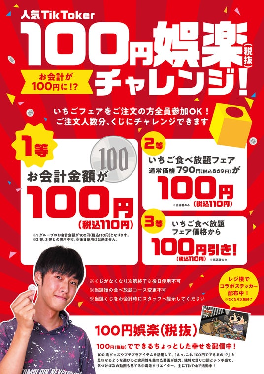 当日会計が100円に?人気TikToker「100円娯楽(税抜)」とのコラボ企画も同時開催!