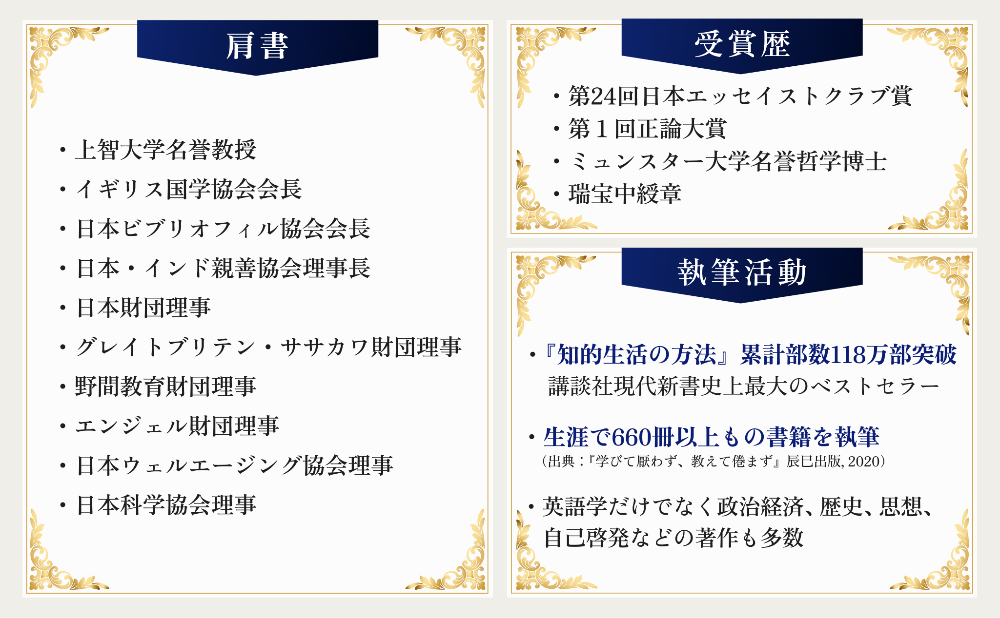 イギリスに留学した経験から、主に詩や小説・神話などの文献(原典)を通じて西洋と日本を比較する「比較文化」のアプローチで、日本独自の文化を探求。国内外の大学、教育者、経営者に向けて、日本の歴史や文化の魅力を発信し続けている。