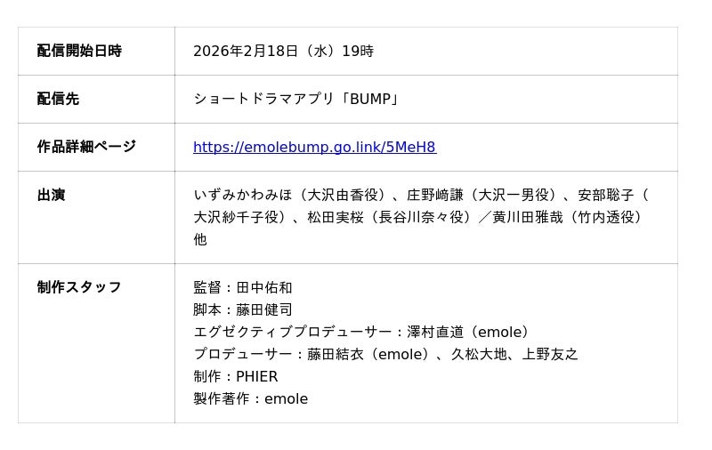 ショートドラマアプリ「BUMP」を運営するemole株式会社(本社:東京都目黒区、代表取締役:澤村直道、以下 emole)は、BUMPオリジナルショートドラマ『有能妻の開花~私を見下す夫と姑、泣きついてきてももう遅い~』を2026年2月18日(水)19:00よりBUMP独占配信いたします。
