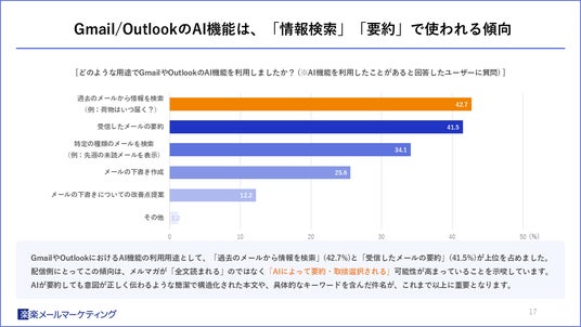 GmailやOutlookにおけるAI機能を一度でも利用したことがあるユーザーを対象に、その用途を質問したところ、「過去のメールから情報を検索」(42.7%)と「受信したメールの要約」(41.5%)が上位を占めました。