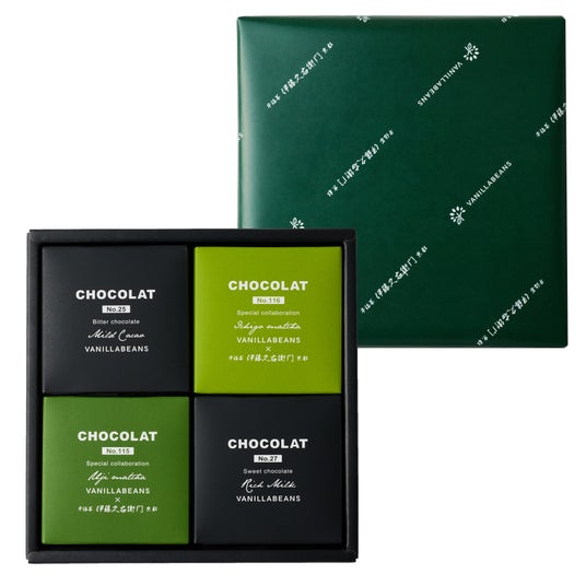 VANILLABEANSが看板商品として掲げる、生チョコクッキーサンド『ショーコラ』から、いちごの甘酸っぱさと宇治抹茶の豊かな香りが調和した二層仕立ての「いちご抹茶」と、伊藤久右衛門の宇治抹茶の香りと味わいを最大限に引き出した「宇治抹茶」の限定フレーバー2種に加え、定番の「マイルドカカオ」と、優しい甘さが人気の「リッチミルク」を詰め合わせた4個入です。
