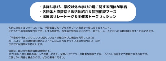 本イベントは、地域の多様な学びの実践を可視化し、家庭や支援者が安心して選択肢を知り、つながれる機会をつくることを目的としています。