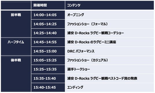 ・ステージ:ファッションショー、浦安D-Rocksラグビー観戦コーデショー、選手トークショー、ラグビーミニ講座、DRCパフォーマンス