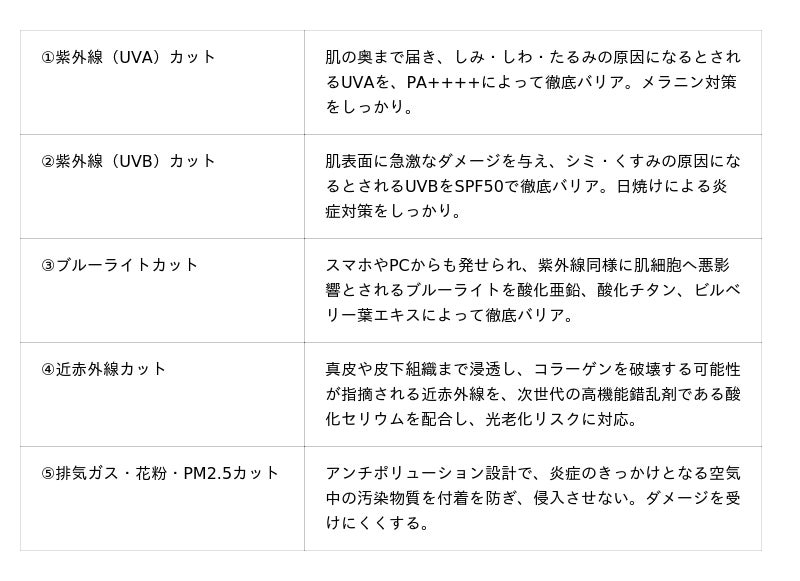 ”守る・魅せる・叶えるのトリプルアプローチ”によって「使うほど美しく」■1. 守る:肌老化の原因と考えられる「4種の光を徹底カット」+「炎症のきっかけをブロック」