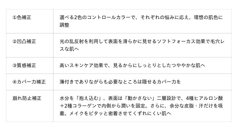 5つの補正機能によって、なめらかな艶肌を長時間キープします。しなやかな崩れにくいベールが肌を纏い、1日の終わりまで、塗った直後と変わらない仕上がりが続きます。