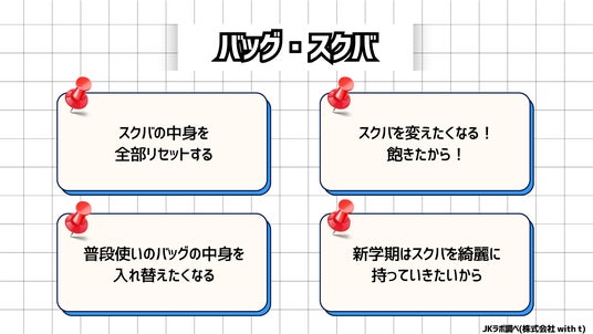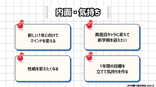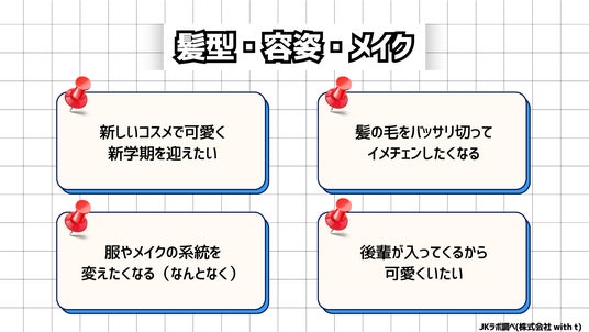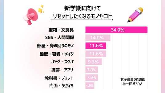 ティーン向けエンタテインメント事業を展開する株式会社with t(本社:東京都渋谷区、代表取締役社長:宮城啓太)が運営する、女子高生の「最旬トレンド」を発信・分析するメディア&シンクタンク「女子高生ラボ」は、現役女子高生を対象に「新学期に向けたリセット(見直し)に関する実態調査」を実施しました。