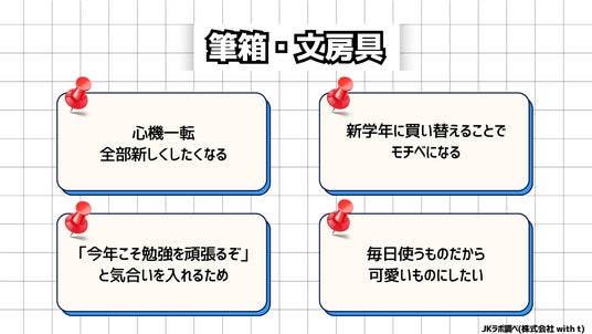 「文房具を新調してモチベーションを上げたい!」 最も多かったのは、毎日使う勉強道具の買い替え。新しいペンケースや文房具を揃えることで、視覚的に「新しい自分」を演出し、学習意欲をブーストさせる傾向が見られます。