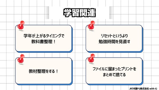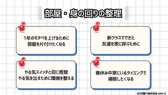 - 内面の自己投資学習教材の整理や気持ちの切り替えなど、新学期という節目を「自分を新しく創り直すチャンス」と捉えている。