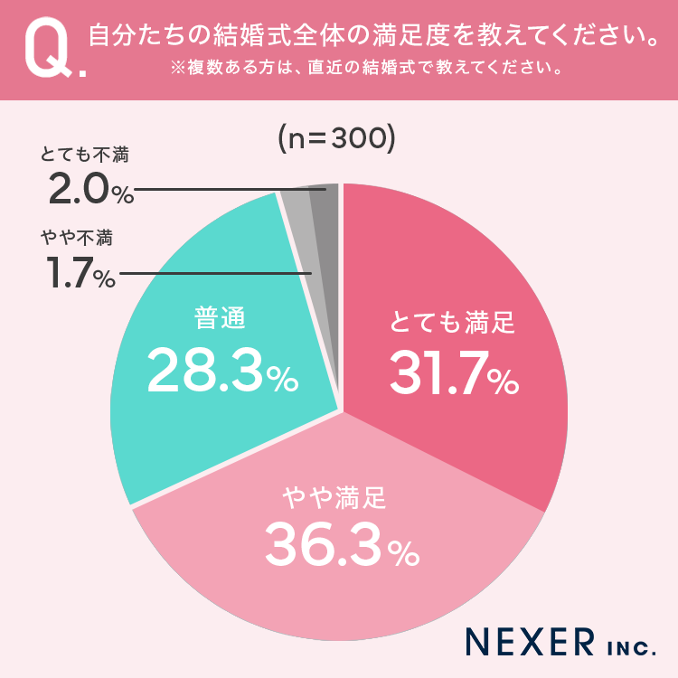 結婚式経験者の約7割が「とても満足」「やや満足」と回答しており、総じて高い満足度が示されました。