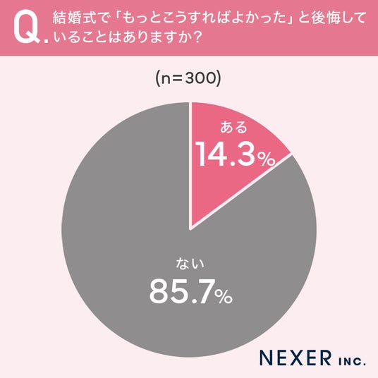 結婚式経験者のうち、85.7%が「後悔していることはない」と回答しました。