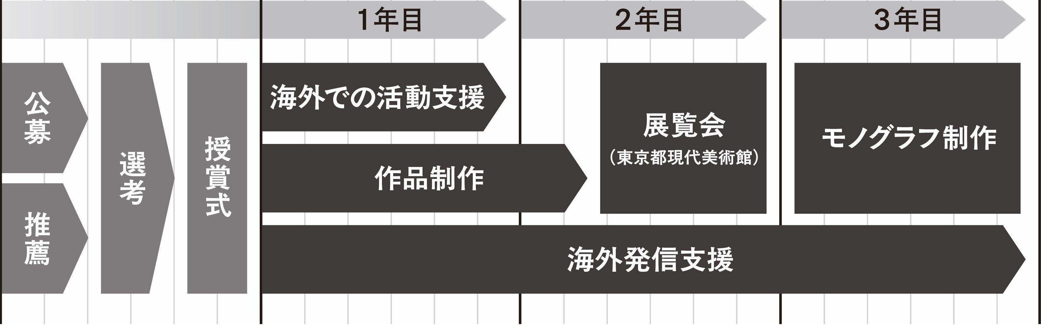 海外での展開も含め、更なる飛躍とポテンシャルが期待できる国内の中堅アーティストを対象とした現代美術の賞。アーティストのキャリアにとって最適な時期に最善の支援内容を提供する必要性を重視し、受賞者の選考は、選考委員によるアーティストのリサーチやスタジオ訪問により、制作の背景や作品表現、キャリアステージへの理解を深めた上で行われます。受賞者には、海外での活動支援のほか、東京都現代美術館での展覧会およびバイリンガルでのモノグラフ(作品集)の作成など、複数年に渡る継続的な支援を行います。www.tokyocontemporaryartaward.jp/