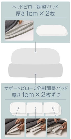 特にサポートピローの調整パッドは、3分割されており、両サイドだけ高め、真ん中は低めなど細かい調整ができ、ほんの少しの高さの違和感でも解消できるよう工夫されています。