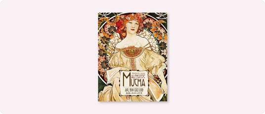 精巧な花のモチーフや装飾的な要素、印象的な色彩表現は、ミュシャ独自の様式を形づくっています。宝飾品、壁紙、室内装飾など、きわめて幅広い領域に応用されたそのデザイン力は、1902年刊行の『装飾資料集』にもまとめられ、現代のクリエイターがデザインの法則を学ぶ上での必読書です。
