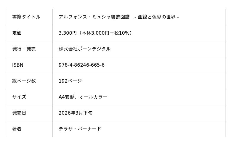 株式会社ボーンデジタル(本社:東京都千代田区、CEO:新 和也、URL:https://www.borndigital.co.jp)は、『アルフォンス・ミュシャ装飾図譜 -曲線と色彩の世界-』(著:テラサ・バーナード)を2026年3月下旬に発売いたします。