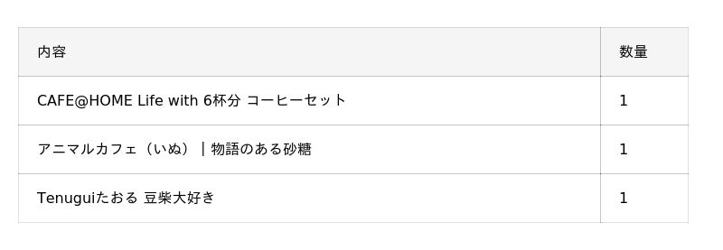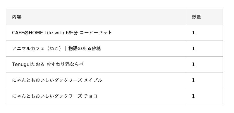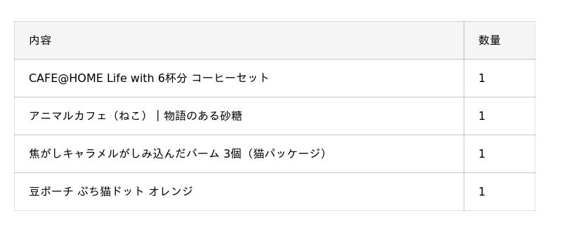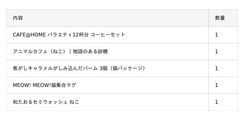 CAFE@HOMEの人気商品12種とスイーツ、猫のマグやタオルなどが詰め合わせになっている豪華なセット。