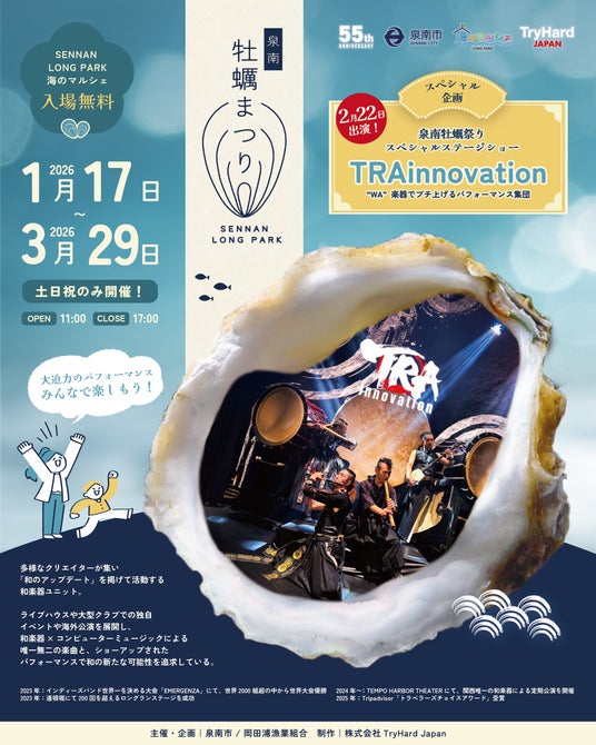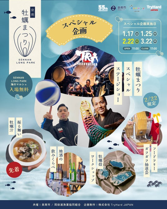 株式会社TryHard Japan(NASDAQ: THH 上場 TryHard Holdings Limited の子会社)は、泉南市および岡田浦漁業協同組合と連携し、SENNAN LONG PARK(センナンロングパーク)内「海のマルシェ」(大阪府泉南市りんくう南浜2- 201)にて、開催中の冬季イベント「泉南牡蠣まつり」において、2026年2月22日(日)にスペシャル企画を実施いたします。