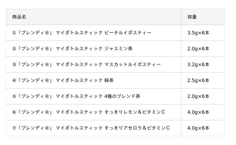 1.《「ブレンディ(R)」 マイボトルスティックピーチルイボスティー》は、やさしいピーチ風味のルイボスティーです。