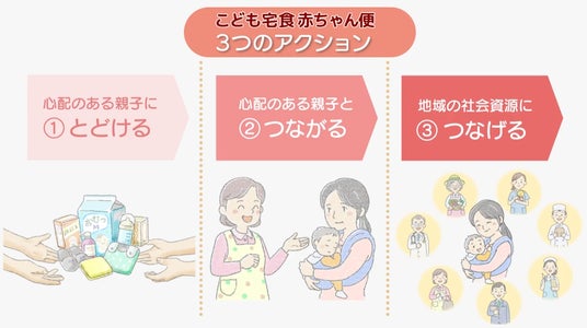 「こども宅食 赤ちゃん便」は、産前産後に何らかの心配や課題を抱えた家庭に訪問し、食品、オムツやミルク、離乳食といった赤ちゃん用品などを届け、会話をしながら相談援助を行う訪問型の活動です。